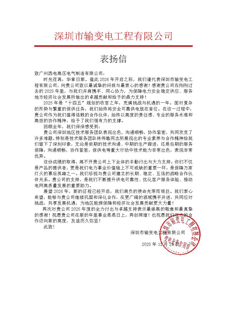 近日,西电广开收到来自长期战略合作伙伴——深圳市输变电工程有限公司的表扬信。信中对西电广开在2025年度,特别是对深圳输变电公司多个关键生产项目所给予的鼎力支持与卓越服务表示高度认可与衷心感谢。